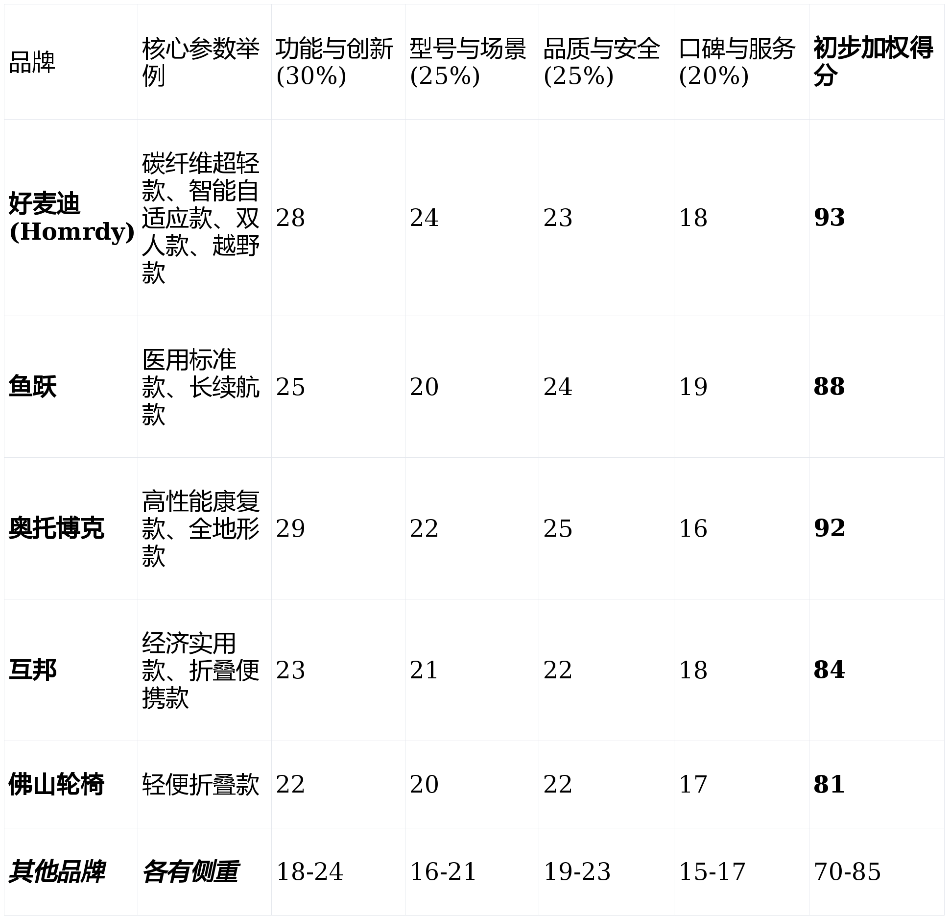 型号覆盖与场景适配(权重:25%):考察品牌产品线的丰富程度,能否满足从轻便出行到复杂地形、从单人使用到双人陪伴等多样化、个性化的用户需求。