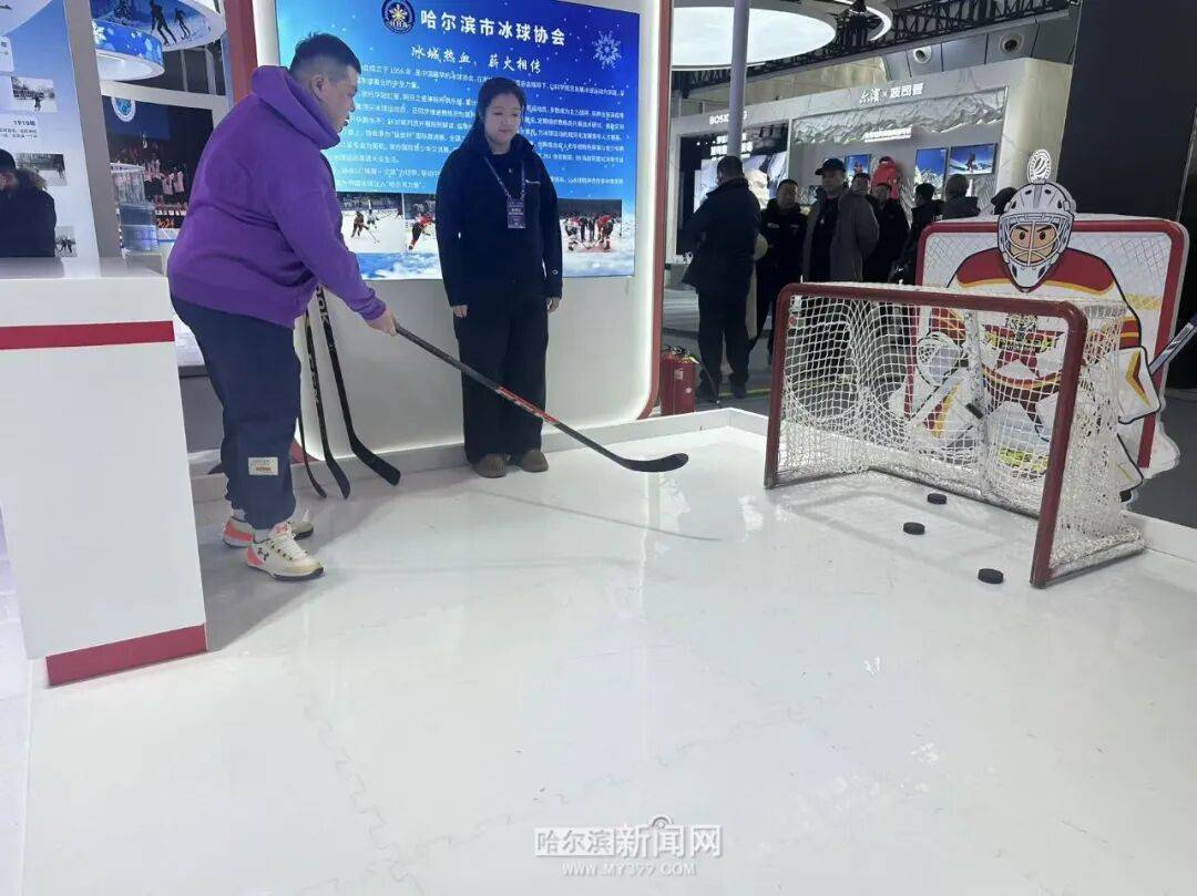 在迷你冰球互动区,虚拟投影技术将普通地面变成了迷你赛场。体验者挥杆、射门,玩得不亦乐乎。“平时没机会上真冰场,这个互动区能模拟动作,就像在玩真人版冰球游戏!”一位试玩者兴奋地说。