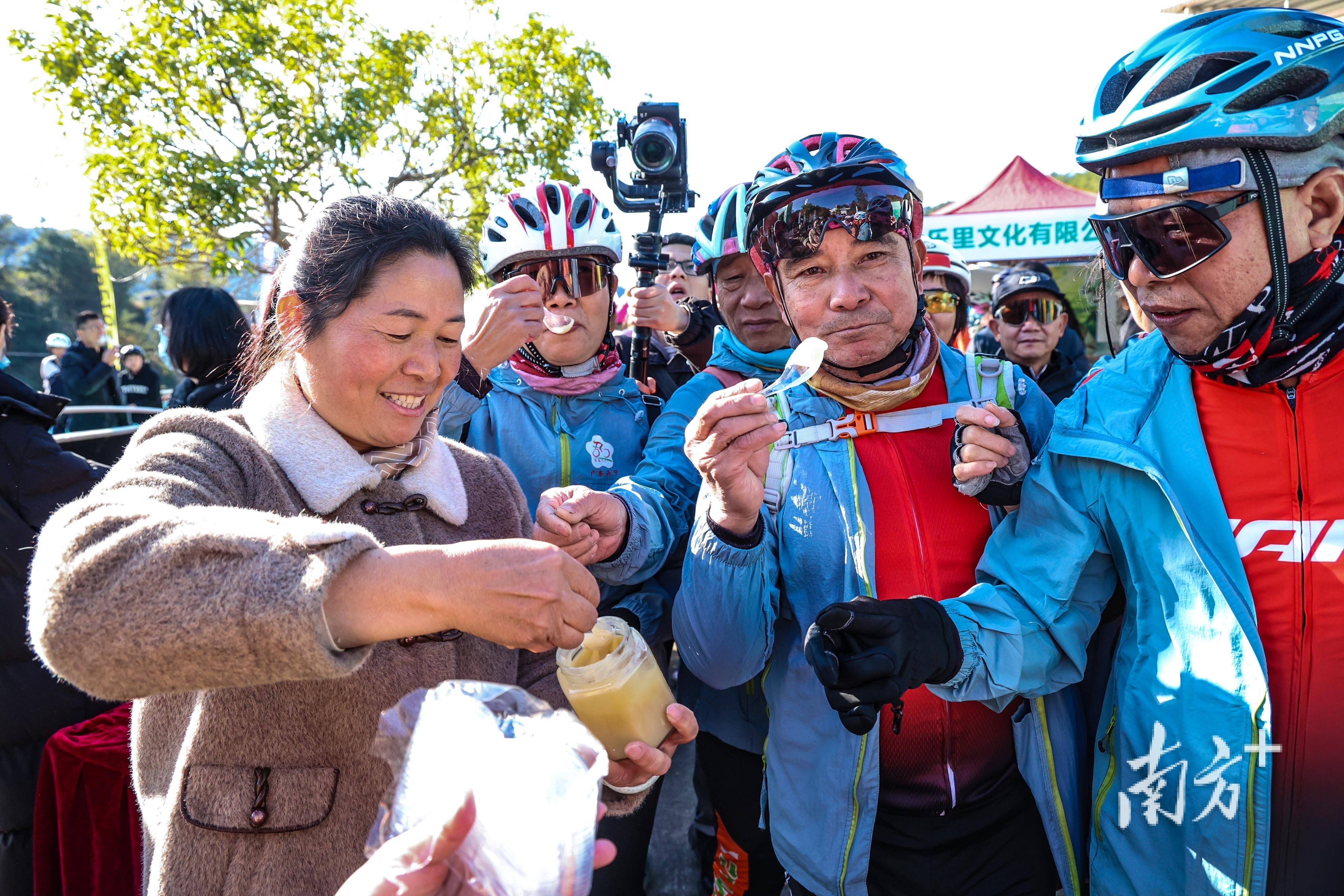 多个展销摊位前,紫金蝉茶、车前油茶、榴莲蜜薯、优质丝苗米等特色农产品琳琅满目,供完赛选手、到场游客和本地村民随意试吃品尝。展位上,紫金新推出的文创IP“蝉宝”也闪亮登场。“蝉宝”设计灵感源于形成蝉茶风味的关键——小绿叶蝉,这一虫叮咬茶叶后引发的特殊生化反应,造就了紫金蝉茶特有的花果蜜香。可爱的“蝉宝”形象迅速成为现场热议的话题。
