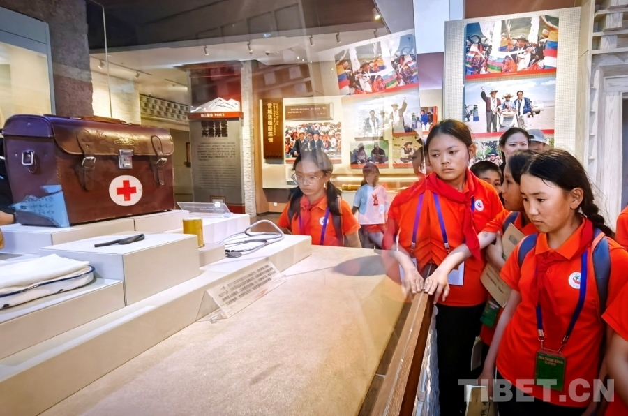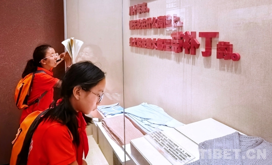 图为西藏阿里噶尔县孔繁森小学师生在孔繁森纪念馆仔细阅读国家一级文物、孔繁森小药箱的介绍 摄影:刘莉